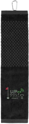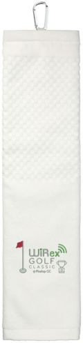 This heavyweight 3.5lb/dozen golf towel is 100% cotton and has a tri-folded design for scrubbing your golf balls and clubs. Comes with a grommet and aluminum carabiner clip for attaching to your golf bag.